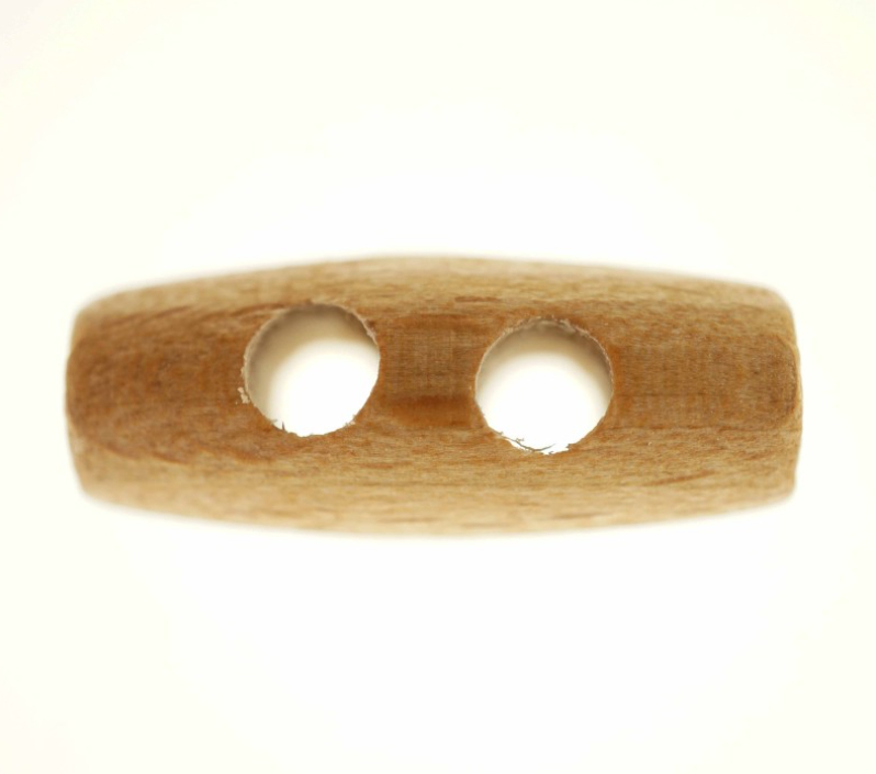 Lysebrun duffel træknap til dig, som ønsker en lidt anerledes knap med mulighed for en spændende lukning. Knappen er aflang og måler 30 mm. På midten hvor knappen bliver tykkere har den to mellemstore huller, som går tværs igennem knappen. Duffel knappen giver mulighed for en flot snorelukning, som er populær på mange vinterjakker, strikketrøjer og cardigans. Knappen har en naturlig mørk træfarve med både mørke og lyse nuancer. For at opnå et naturligt look kan knappen med fordel sættes på tøj i naturfarver som råhvid, beige, sand, brun og sort.